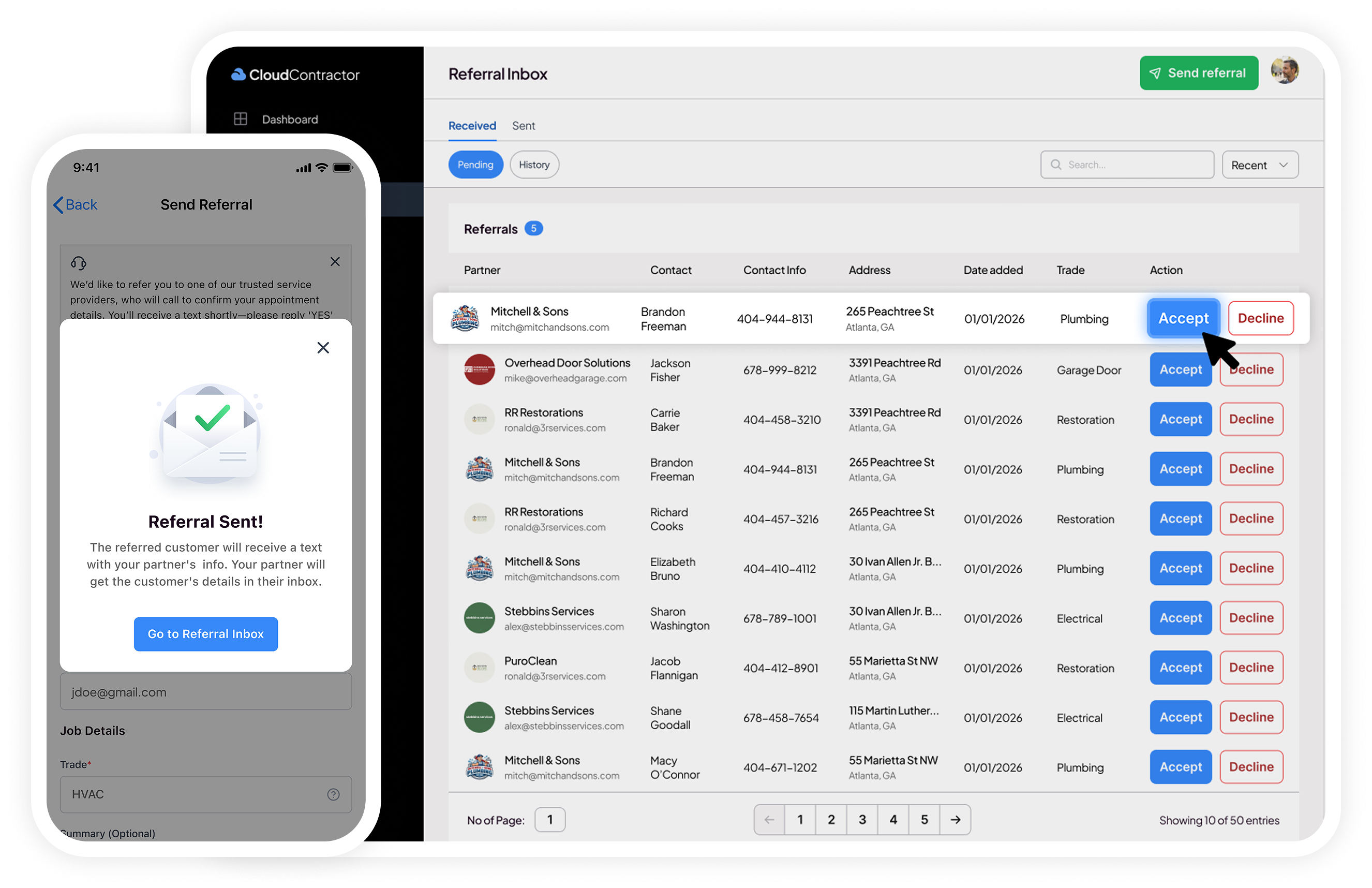 Stop letting unserviced Β jobs go to waste. Get paid for receiving or sending referrals to contractors near you.